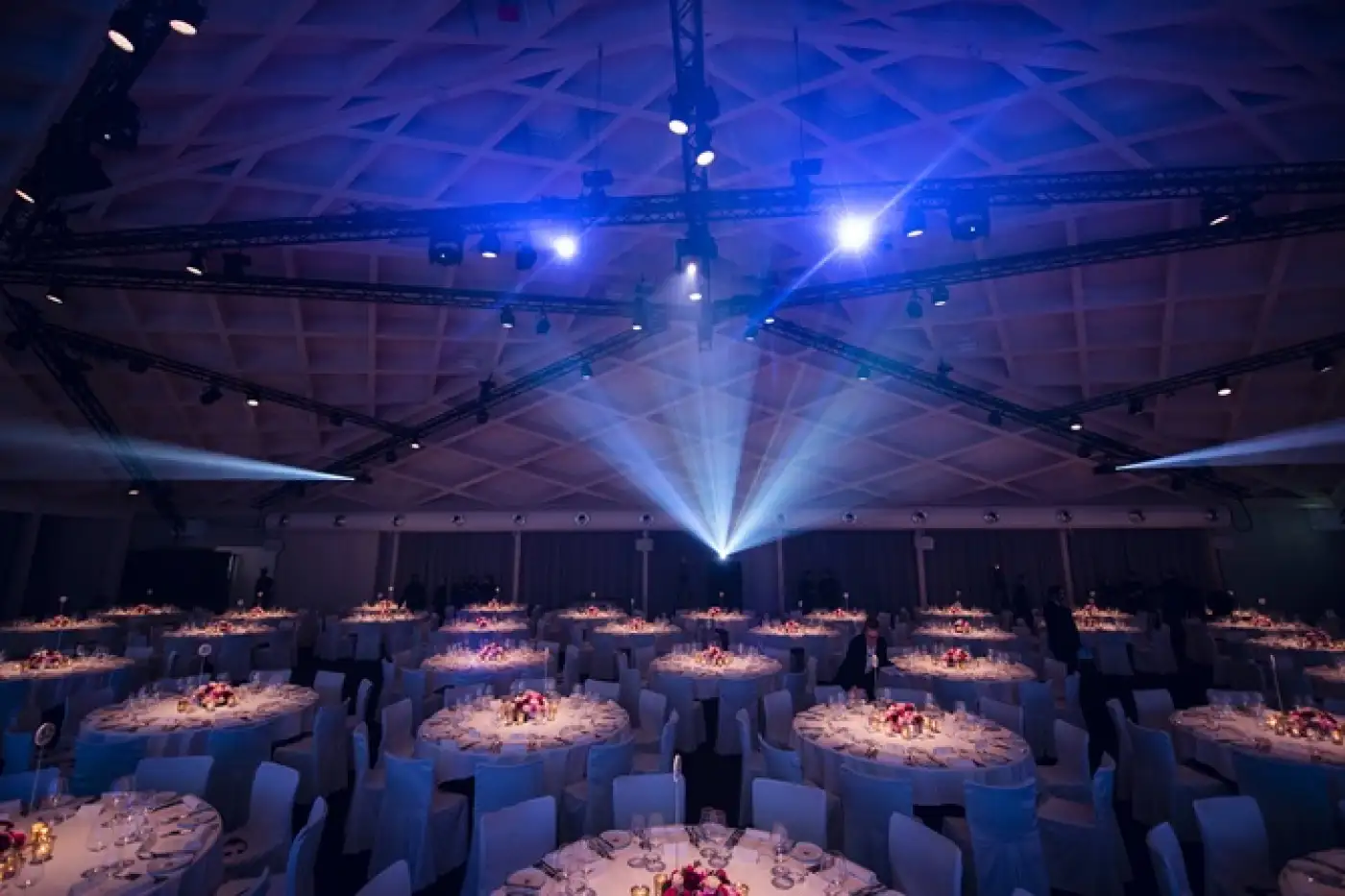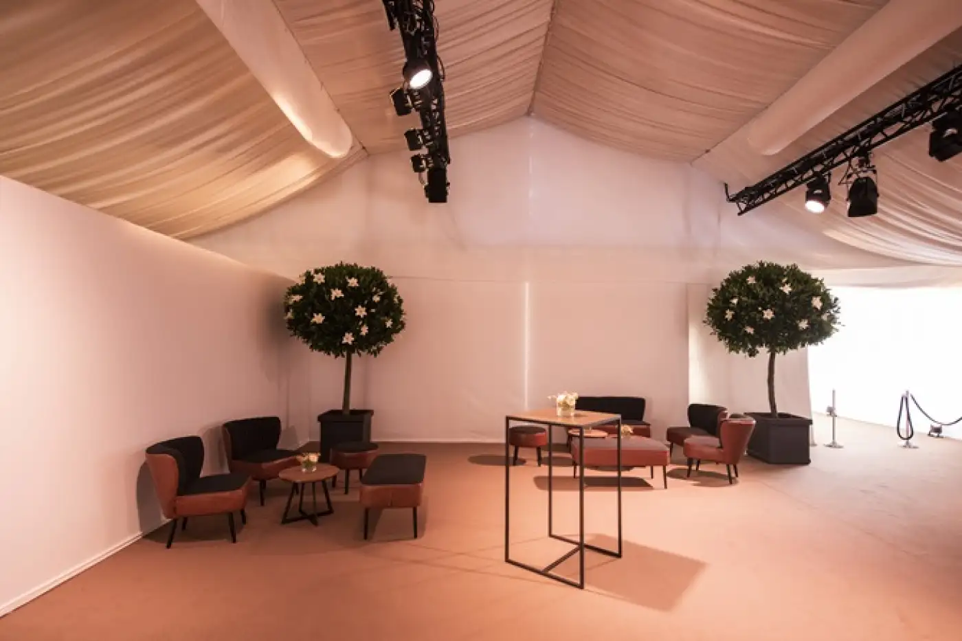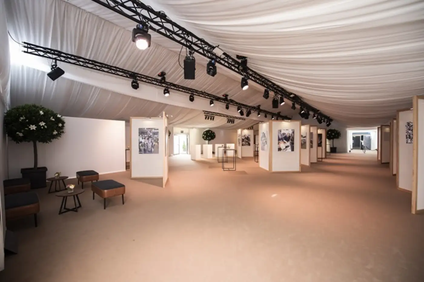 Recently, working on a commission for Komvent, our exhibition booth company implemented a customized set design for a corporate event with 450 guests at the Bürgenstock. Over the course of two days, the Diamond Domes Tennis and Event Hall was transformed by our exhibition booth builders to create a party atmosphere. Together, the nostalgic welcome area with photo panels, the cozy dining hall for the evening meal and the modern dance floor set the scene for the occasion.