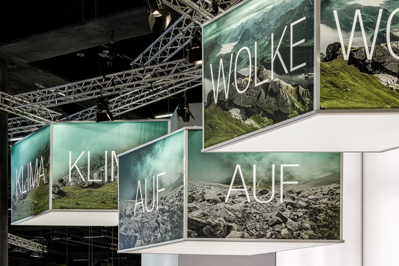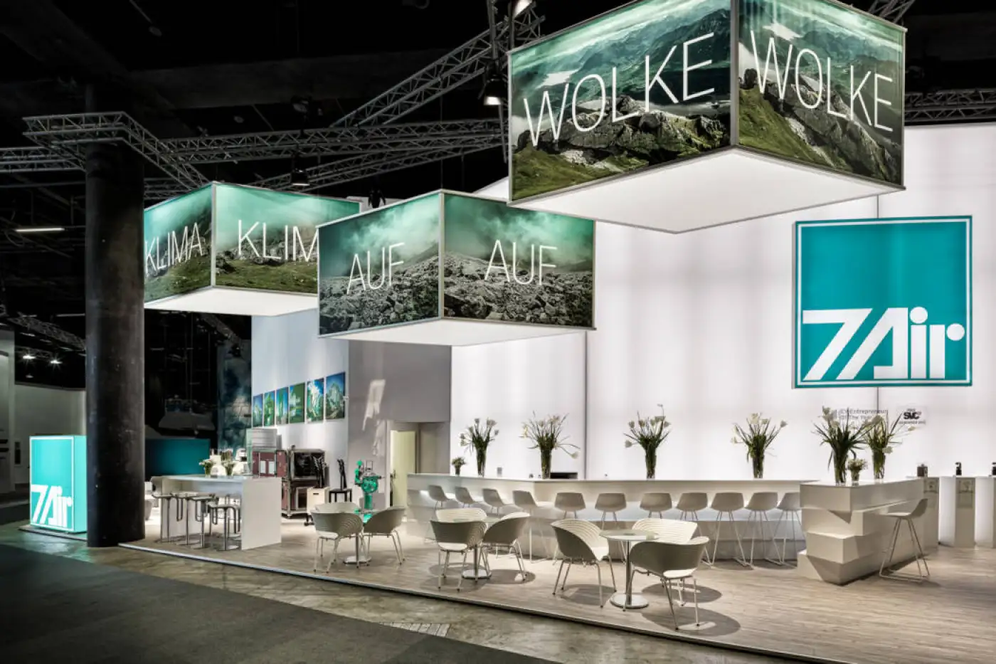 Mit expomobilia hat die Seven-Air Gebr. Meyer AG bereits 2016 zusammengearbeitet. Der für die Swissbau damals entworfene Messeauftritt wird dieses Jahr neu aufgelegt. So wurde das bestehende Konzept, das bogenförmig um den Lichthof der Messe angelegt war, auf eine grössere Standfläche erweitert. Zudem wurde das neue Branding frei nach dem Motto «Klima auf Wolke 7» entsprechend luftig umgesetzt: Weisse, leichte Stoffe verkleiden die verschiedenen Standelemente und werden zum Teil hinterleuchtet. Die schlichte und luftige Aufmachung lenkt die Aufmerksamkeit der Besucher auf die wesentlichen Elemente am Stand: Produkte und Begegnungszonen.