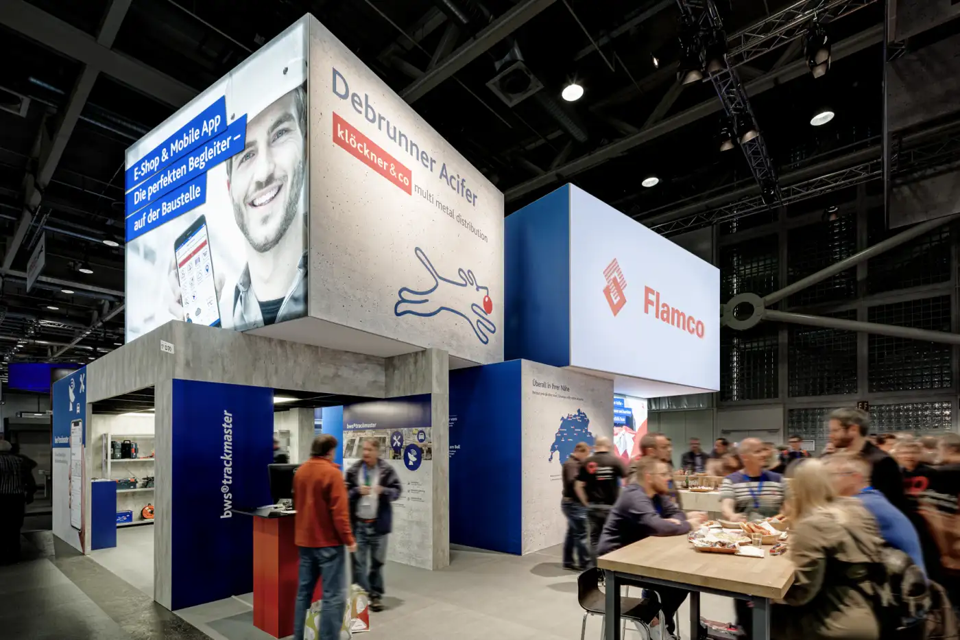 This year, the inspiration for the cubic design of the trade fair presentation came from the shapes of the containers found on construction sites and the material concrete. This is how the nested elements were created, which are covered with printed fabric in a concrete look. Debrunner Acifer presents testimonials from customers, suppliers and experts on a 6m² projection surface.