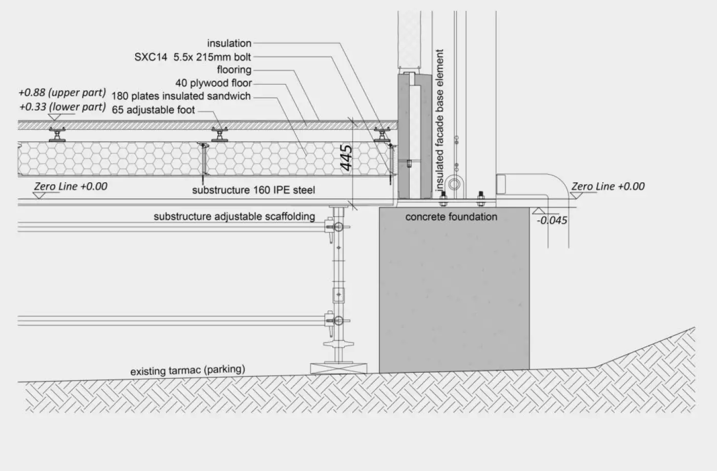 The sloping conference floor was made of scaffolding material. Sandwich panels were laid on top. These panels are normally only used for walls and roofs. On the one hand, this method is sustainable (reusability of the materials) and on the other hand, it is installed very quickly.